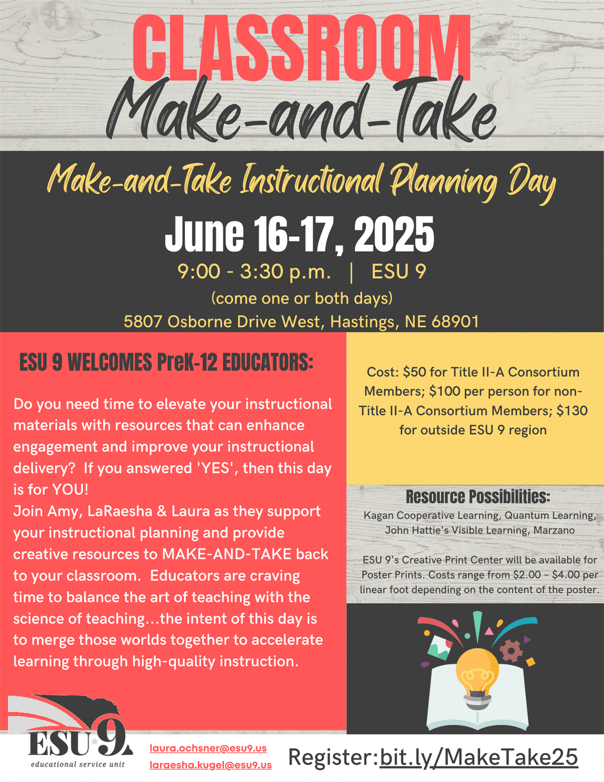 ESU 9's Creative Print Center will be available for Poster Prints. Costs range from $2.00 – $4.00 per linear foot depending on the content of the poster.