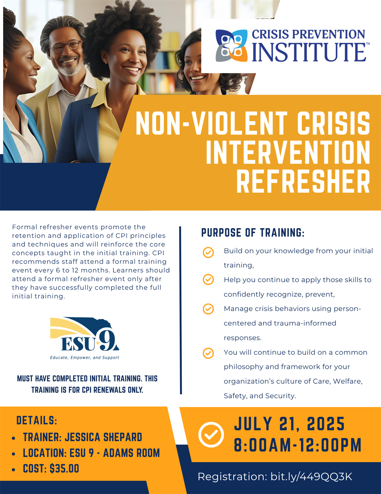 Only available to those who have completed the full Non-verbal Crisis Intervention CPI Training initially and are due for a 1 year refresher training to stay certified for another year.